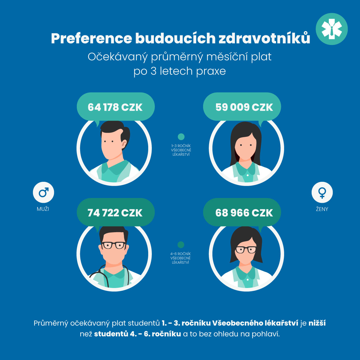 Preference budoucích zdravotníkůKdyž jsme se respondentů zeptali, jaký plat očekávají za svou práci po třech letech praxe, dostali jsme velice široké spektrum odpovědí. Nejvyšší plat očekávají studenti čtvrtého až šestého ročníku všeobecného lékařství a to v průměru 70 000 Kč měsíčně. Hned za nimi jsou v závěsu studenti prvního až třetího ročníku s průměrem 60 000 Kč. Okolo 55 000 Kč očekávají plat zdravotní sestry. Studenti všeobecného ošetřovatelství a jiných bakalářských oborů očekávají plat pohybující se kolem 45 000 Kč.Preference budoucích zdravotníkůZ výsledků také vyplývá, že muži mají představy o vyšším platu než ženy, kdy se průměrem pohybujeme až v desetitisícovém rozdílu. Z geografického hlediska na vysokém platu také nejvíce záleží obyvatelům města Prahy, hned za nimi jsou obyvatelé Karlovarského kraje a Královéhradeckého kraje, kdežto na posledním místě se umístili obyvatelé Pardubického kraje, kde je průměrný očekávaný plat 48 000 Kč.