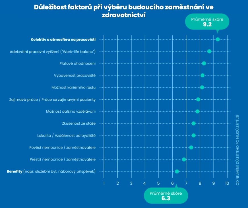Faktory při výběru budoucího zaměstnání ve zdravotnictvíNejdůležitějším faktorem pro budoucí zdravotníky je Kolektiv a atmosféra na pracovišti. Na druhém místě je „Work-life balance“, což potvrzuje, že mladí lékaři a sestřičky očekávají dostatek času na odpočinek a přiměřený počet nočních služeb. Platové ohodnocení je na třetím místě. Na konci žebříčku se umístily benefity jako náborové příspěvky, služební byt atd., které nehrají velkou roli.