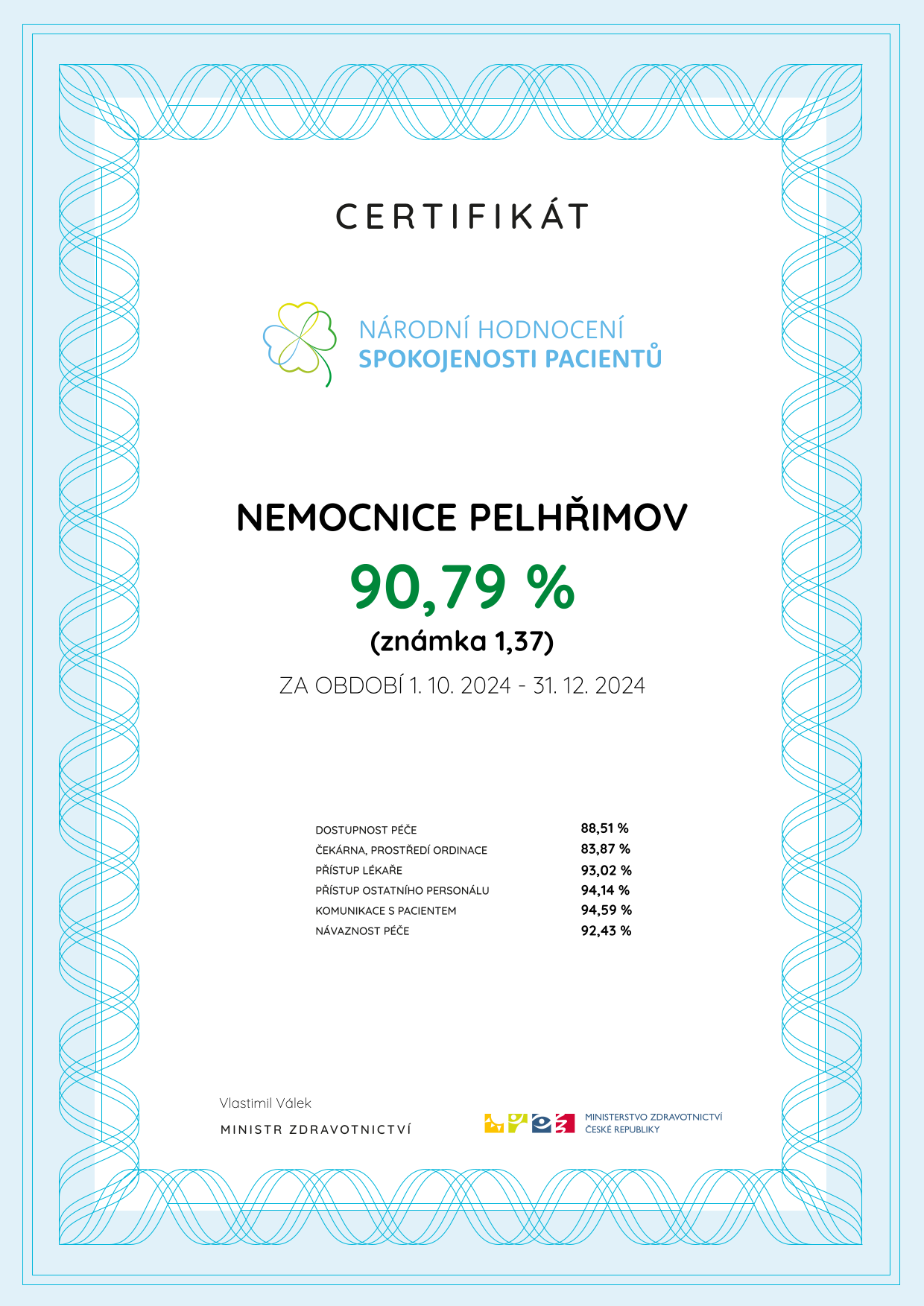 Od 1. října do 31. prosince 2024 probíhalo v Nemocnici Pelhřimov Národního hodnocení spokojenosti ambulantních pacientů MZČR. Nemocnice se umístila na vynikajícím druhém místě. Pacienti hodnotili svou spokojenost s ambulantní péčí ve 23 určených ambulancí (chirurgické, ortopedické, interní, endoktrinologické, hematologické, urologické a dalších), prostřednictvím anonymních dotazníků přes QR kód, ve kterých nemocnice dosáhla průměrné známky 1,37 (90,79%), což znamená zlepšení o 2,12 % oproti minulému hodnocení. Celkem bylo v nemocnici vyplněno 185 dotazníků. „Druhé místo v celorepublikovém srovnání je pro nás velkým úspěchem a potvrzením poskytované bezpečné a kvalitní péče a dalších služeb pacientům od našich zaměstnanců. I přes pozitivní zpětnou vazbu zároveň vnímáme i podněty pacientů k dalšímu zlepšení a stále na nich pracujeme,“ sdělila Pavlína Fridrichovská, manažerka kvality pelhřimovské nemocnice.