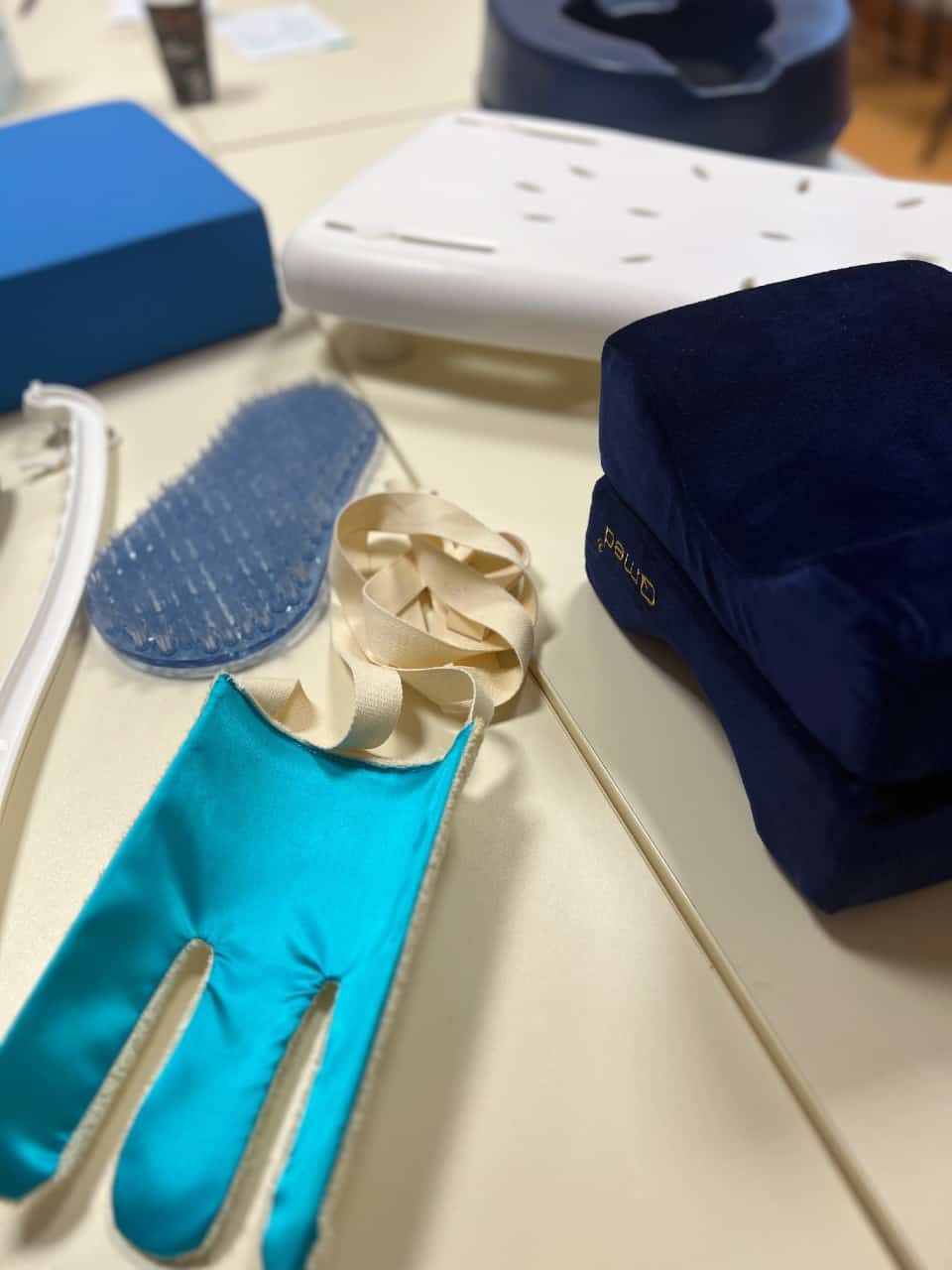Zúčastnění získali podrobné informace o tom, jak taková operace probíhá, jak se na ní připravit a jak vypadá následná péče a rehabilitace po operaci. Ukázali jsme si i spoustu pomůcek, které mohou usnadnit návrat do běžného života v pooperačním období (např. nazouvák ponožek, podavač věcí, nástavce na WC, meziprstní kartáč a kartáč na mytí plosky nohou, zvyšovací nástavce na židle, atd.)