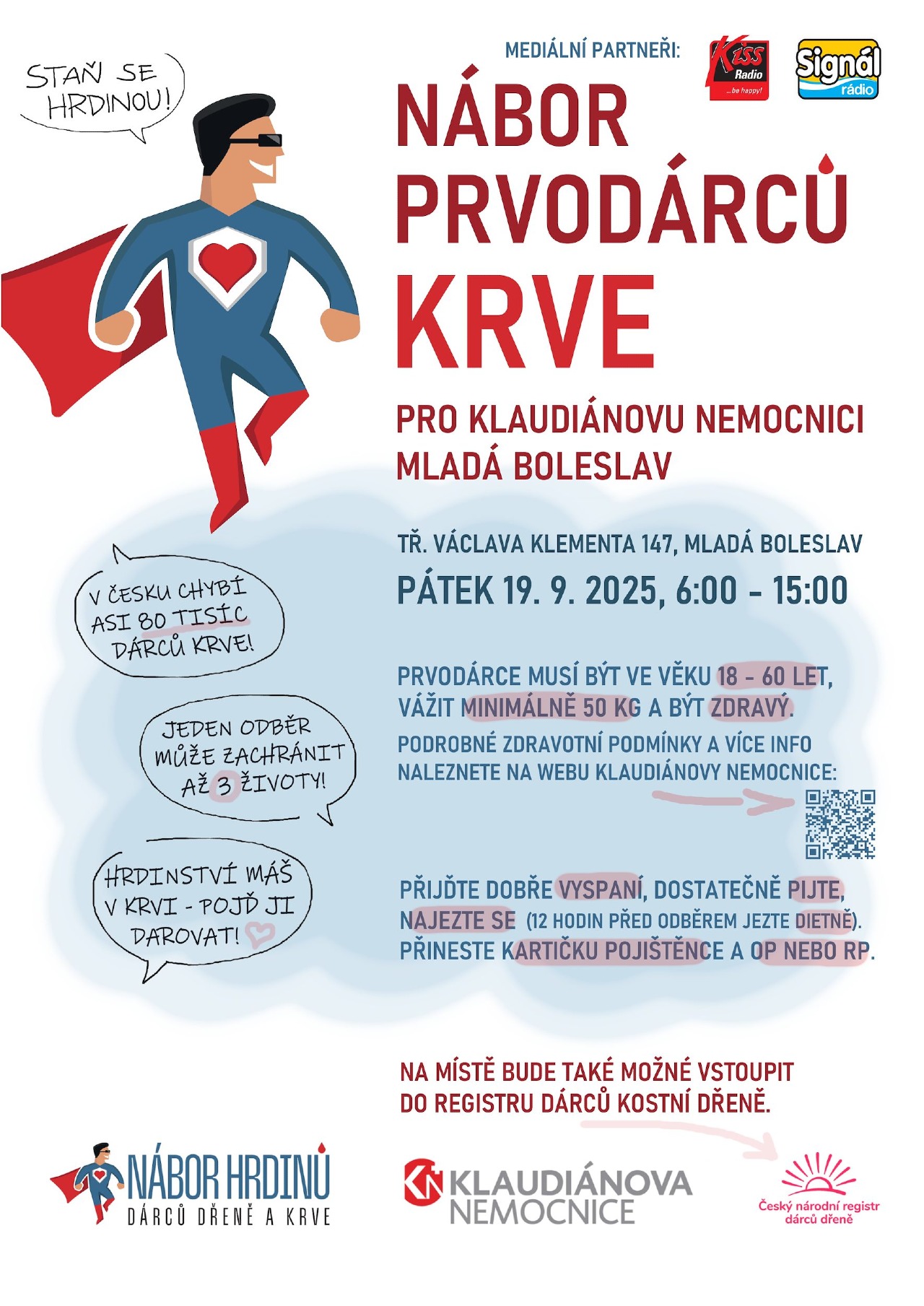 Klaudiánova nemocnice spolu s Náborem hrdinů pořádá v pátek 19.9. 2025 již tradiční akci. Přijďte od 6 do 15 hodin na Hematologicko transfuzní oddělení Klaudiánky darovat svoji první krev. Pro všechny, kteří přijdou, jsme připravili malé dárky. Překvapení pro prvodárce chystají i prvoligoví fotbalisté FK Mladá Boleslav. Těšíme se na Vás všechny. A víte o tom, že jeden odběr krve může zachránit až 3 lidské životy?