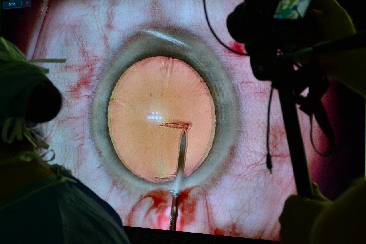 Místo klasických okulárů se používá speciální 3D kamera, která snímá obraz přímo z mikroskopu. Ten se zobrazuje na velkém monitoru. Chirurg i celý tým mají tak stejný pohled na to, co se v oku právě děje.