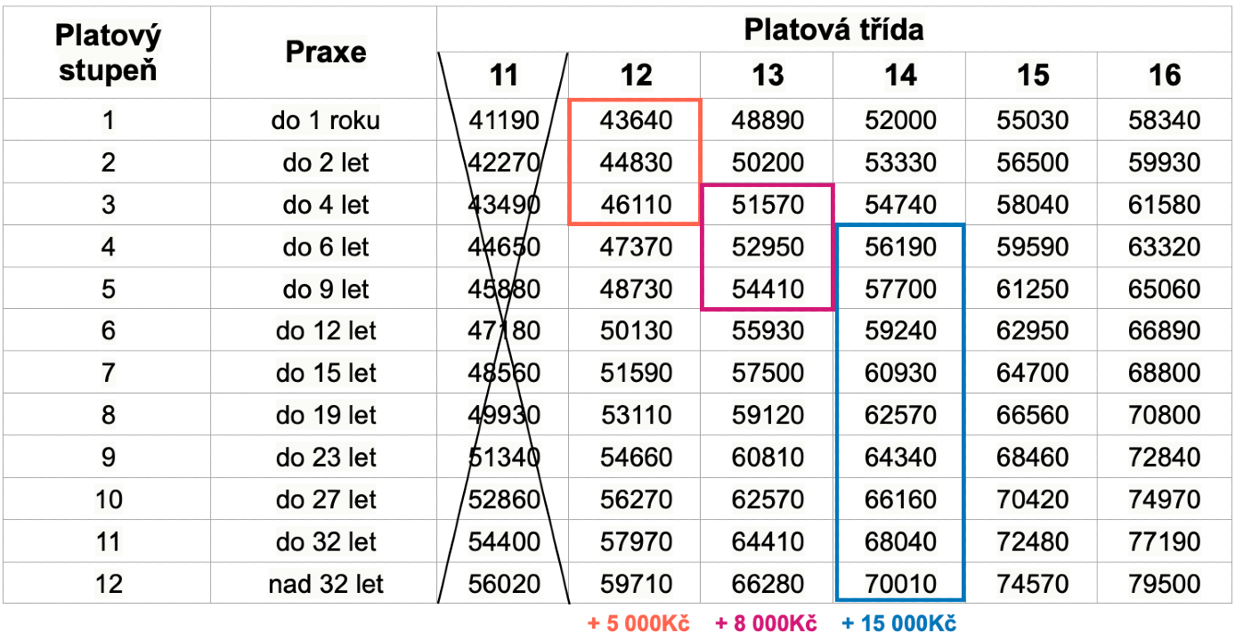Jakmile zhruba po dvou a půl letech (30 měsíců) dokončíte kmenovou zkoušku, přesouváte se do 13. platové třídy a váš plat vzroste na 51 570 Kč bez služeb a příplatků. Pokud složíte atestaci, dostanete se do 14. platové třídy, kde se základní plat pohybuje kolem 56 190 Kč bez služeb a příplatků. Že to stále není úplně ono? Souhlasíme.