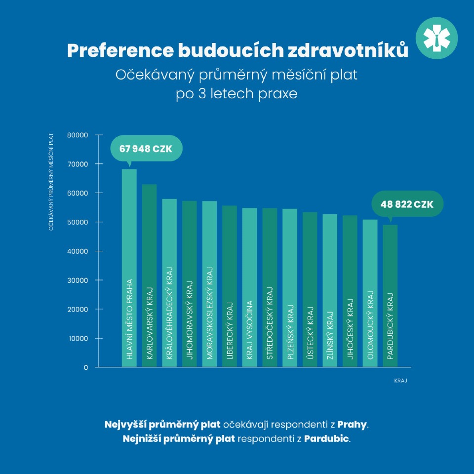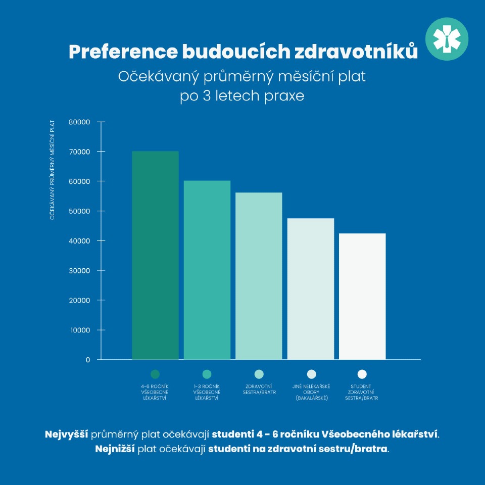 Mezi budoucími zdravotníky převládá preference práce ve veřejných zdravotnických zařízeních, i když více než polovina respondentů uvedla, že jsou v této otázce indiferentní.Preference budoucích zdravotníkůKdyž jsme se respondentů zeptali, jaký plat očekávají za svou práci po třech letech praxe, dostali jsme velice široké spektrum odpovědí. Nejvyšší plat očekávají studenti čtvrtého až šestého ročníku všeobecného lékařství a to v průměru 70 000 Kč měsíčně. Hned za nimi jsou v závěsu studenti prvního až třetího ročníku s průměrem 60 000 Kč. Okolo 55 000 Kč očekávají plat zdravotní sestry. Studenti všeobecného ošetřovatelství a jiných bakalářských oborů očekávají plat pohybující se kolem 45 000 Kč.Preference budoucích zdravotníkůZ výsledků také vyplývá, že muži mají představy o vyšším platu než ženy, kdy se průměrem pohybujeme až v desetitisícovém rozdílu. Z geografického hlediska na vysokém platu také nejvíce záleží obyvatelům města Prahy, hned za nimi jsou obyvatelé Karlovarského kraje a Královéhradeckého kraje, kdežto na posledním místě se umístili obyvatelé Pardubického kraje, kde je průměrný očekávaný plat 48 000 Kč.
