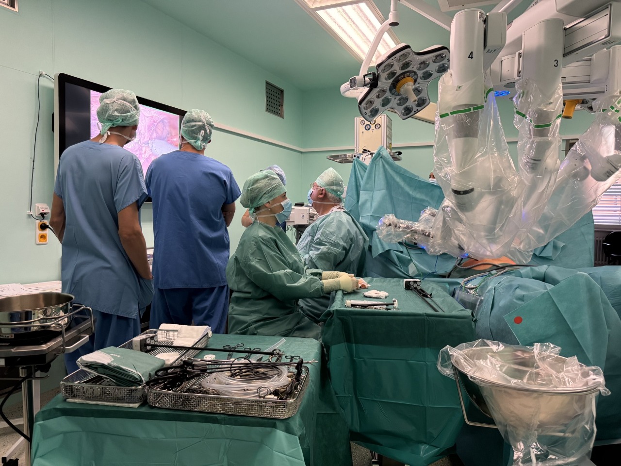 Robotický systém Da Vinci od společnosti Intuitive Surgical, který nyní máme u nás v nemocnici, představuje systém, který využívá minimálně invazivní chirurgický přístup umožňující provedení velkého množství operací. Je to systém velmi komplikovaný, ale současně sofistikovaný, a i když je pro laika velmi podobný laparoskopii, je jeho ovládání diametrálně odlišné a má jistá specifika a postupy, které je třeba dodržovat. Všichni členové našich operačních týmů (operatéři, asistenti i nelékařský perioperační personál) museli před samotným započetím robotické operativy absolvovat několikaměsíční vícefázový edukační program, který byl velmi náročný. V první fázi vyjely týmy „na stáž“ na pracoviště, kde již robotický systém používají. Pokračovali jsme několika desetihodinovými tréninky na simulátoru, dalšími instruktážemi a semináři s praktickou výukou na samotném přístroji na výukových figurínách ve spolupráci se zástupci firmy. Celý proces edukace jsme ukončili tzv. certifikací, která se skládala z praktické a teoretické zkoušky. Tyto certifikační zkoušky skládal chirurgický tým ve Stockoholmu v tréninkovém centru Karolínské univerzitní nemocnice a urologové v simultánním centru a řeckých Aténách.