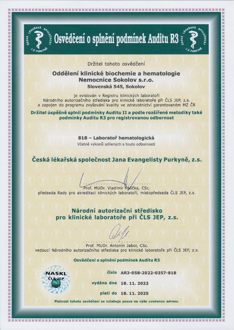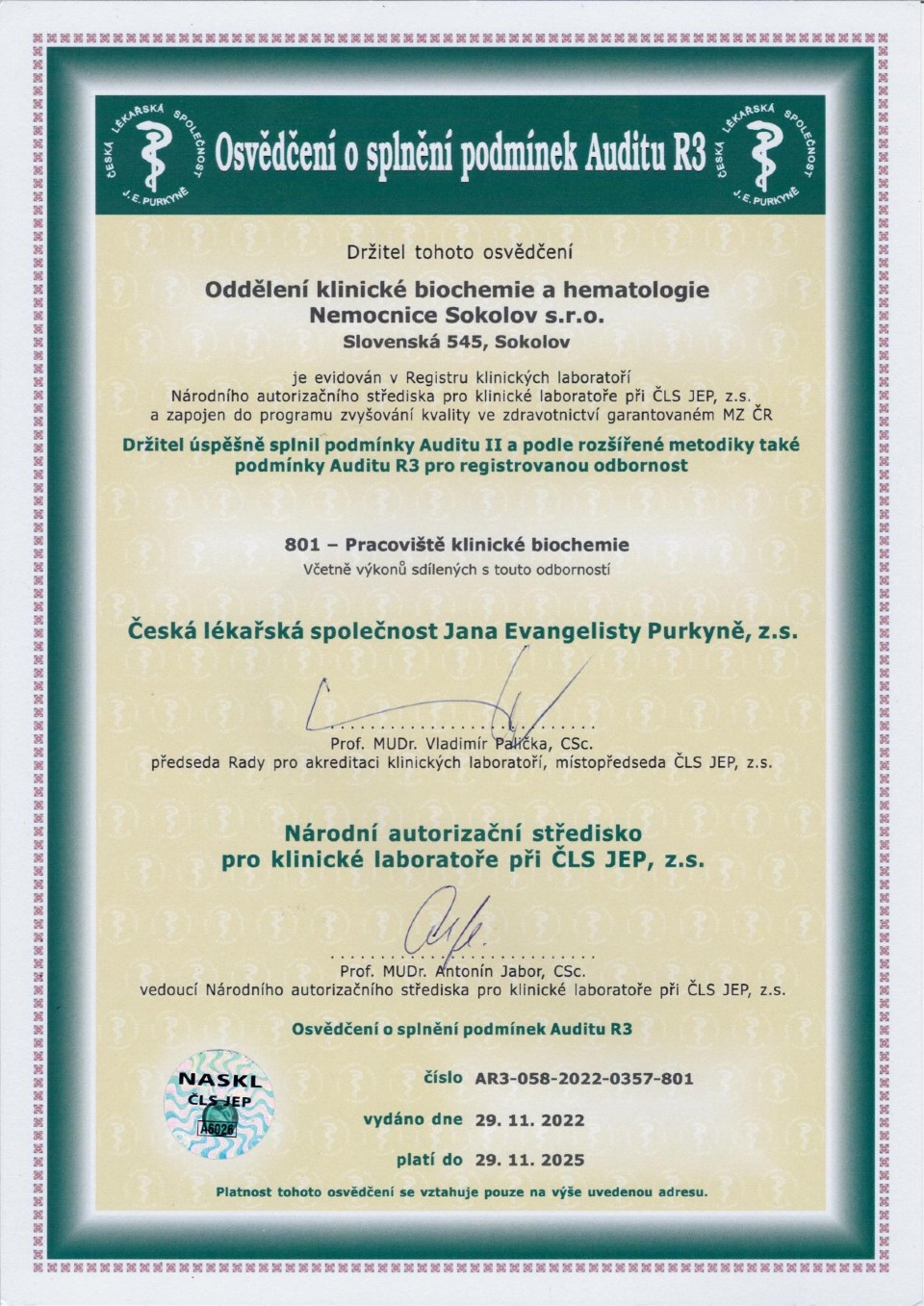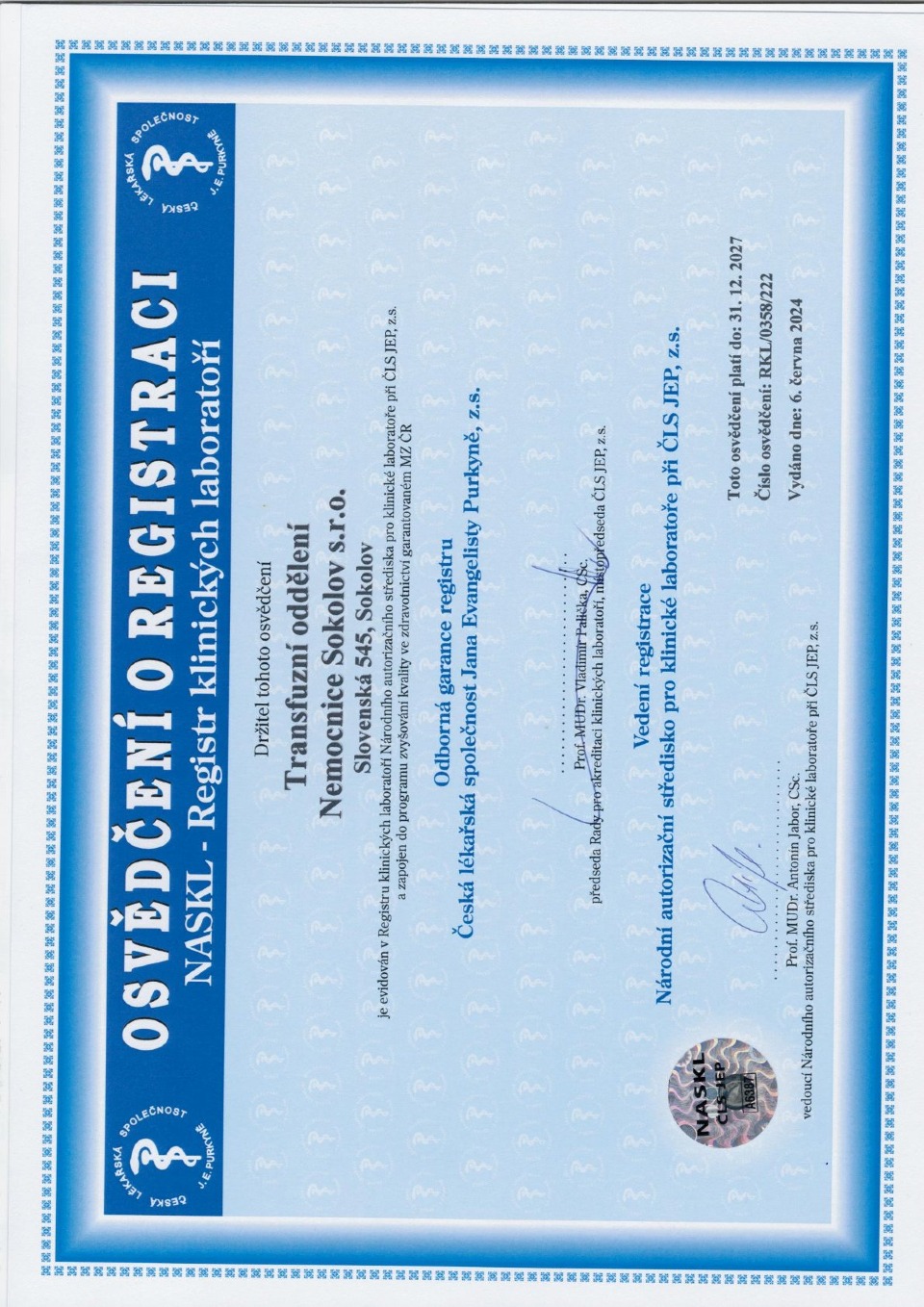 Laboratoře naší nemocnice jsou držiteli osvědčení NASKL II, což je certifikace, která potvrzuje vysokou úroveň a objektivitu prováděných laboratorních vyšetření. Tento certifikát je nejenom ukazatelem kvality, ale i důkazem dlouhodobé snahy našich pracovníků udržovat standardy, které jsou nezbytné pro poskytování spolehlivých a přesných diagnostických výsledků.