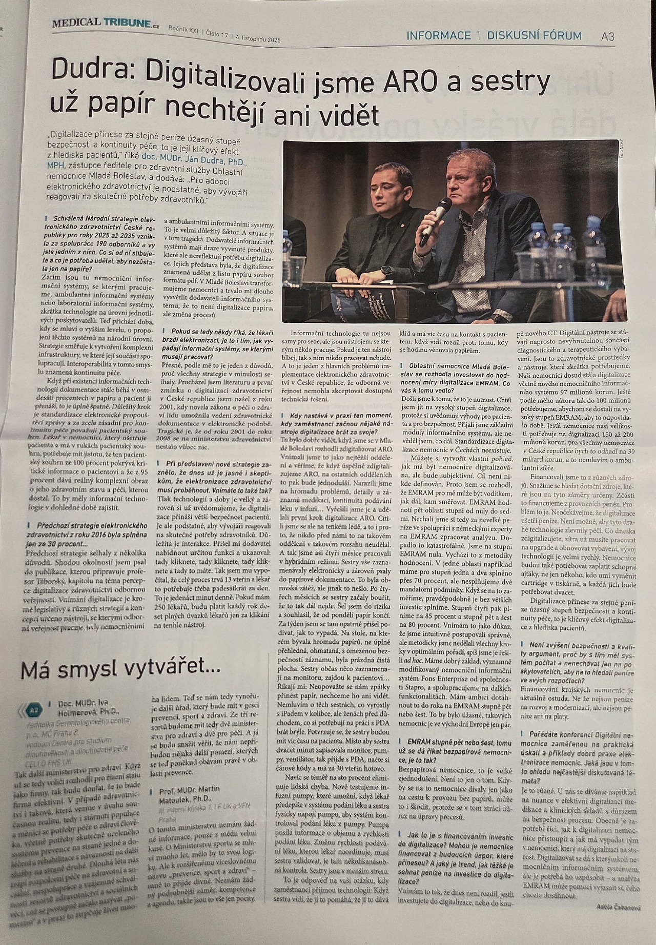 Ještě před konferencí poskytl časopisu Medical Tribune rozhovor na téma digitalizace nemocnic zástupce ředitele pro zdravotní služby Klaudiánky doc. MUDr. Ján Dudra, PhD., MPH.